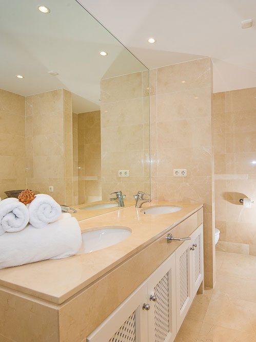 The luxury house bathroom is all marble, with two built in hand basins, toilet, bidet and bath.